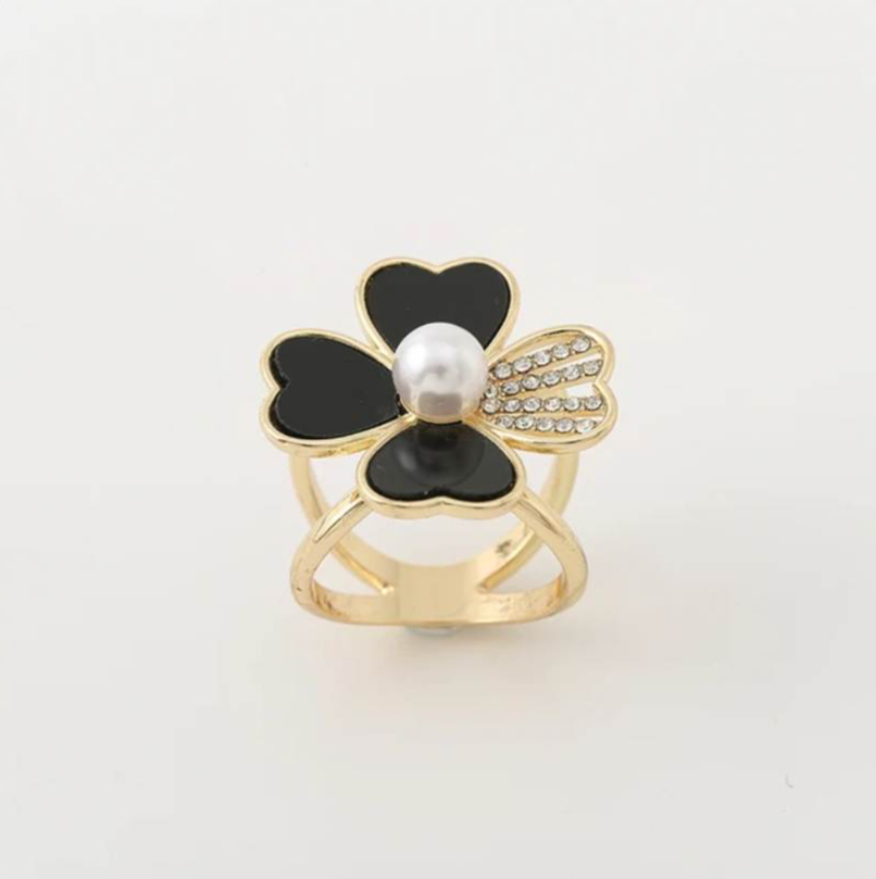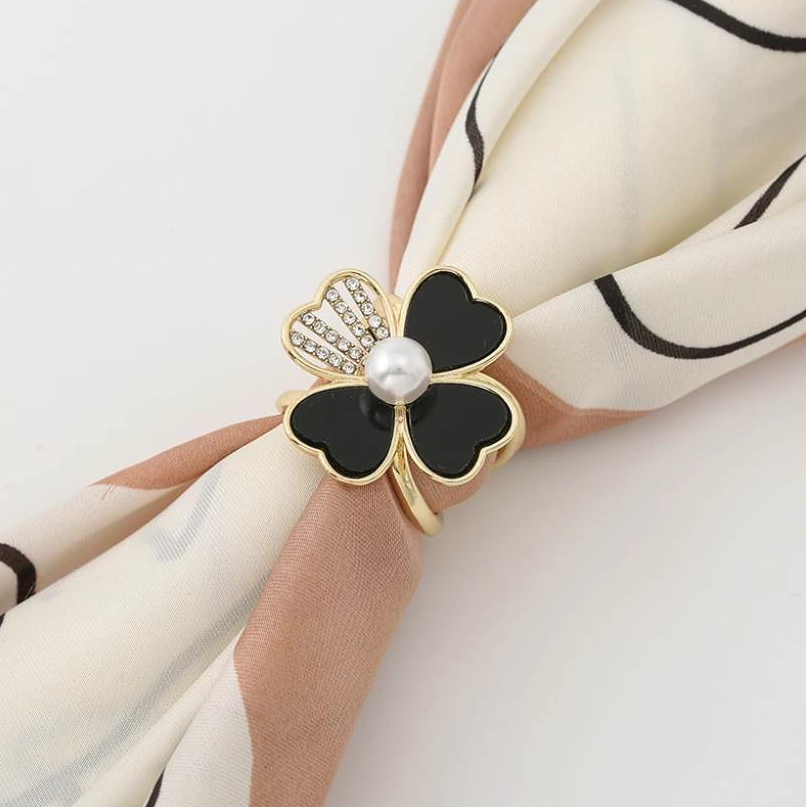 Brošňa na šatku a šál – čierny smaltovaný štvorlístok s kryštálikmi