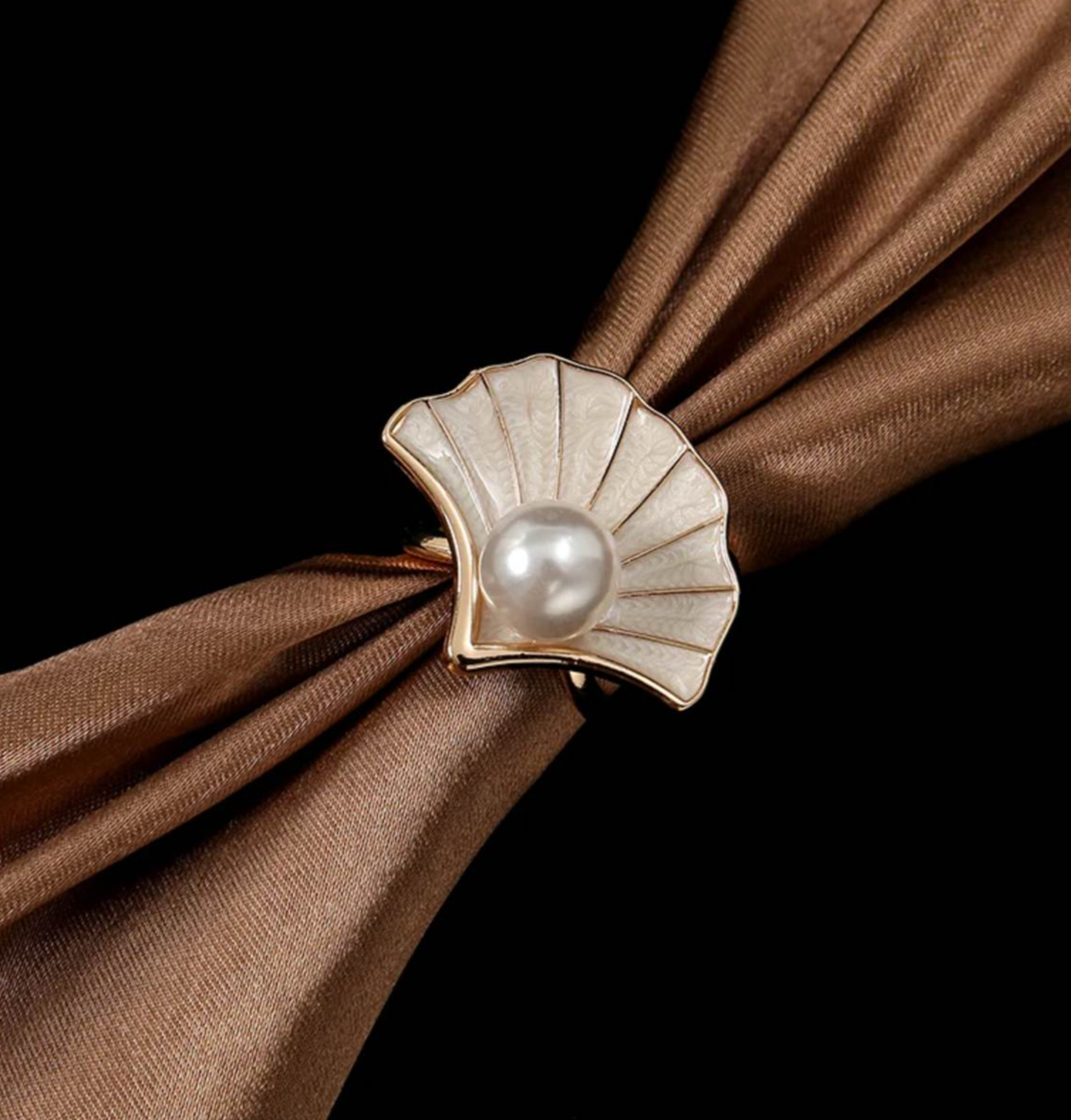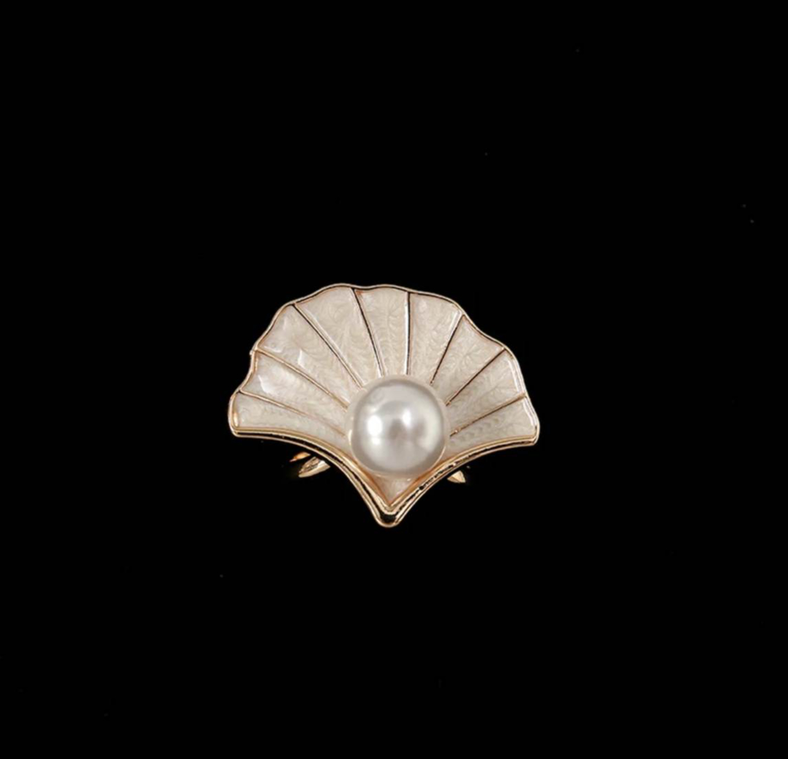 Brošňa na šatku a šál – zlatá smaltovaná mušlička s perlou