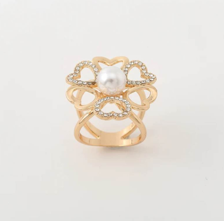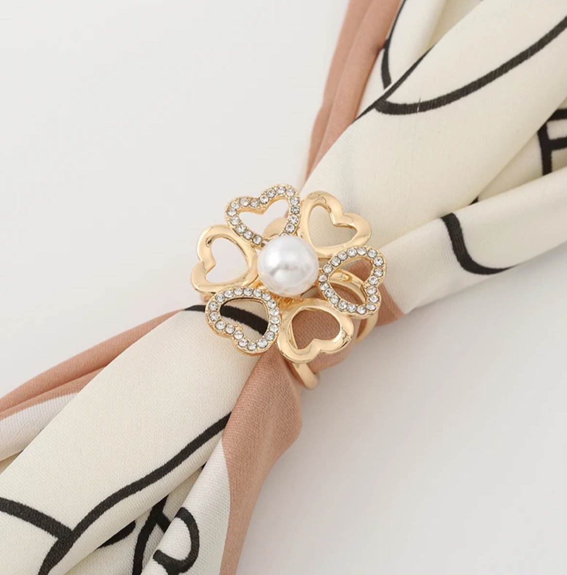 Brošňa na šatku a šál – zlatý uzol so srdiečkami, perlou a kryštálmi