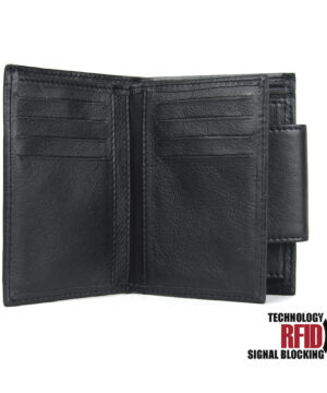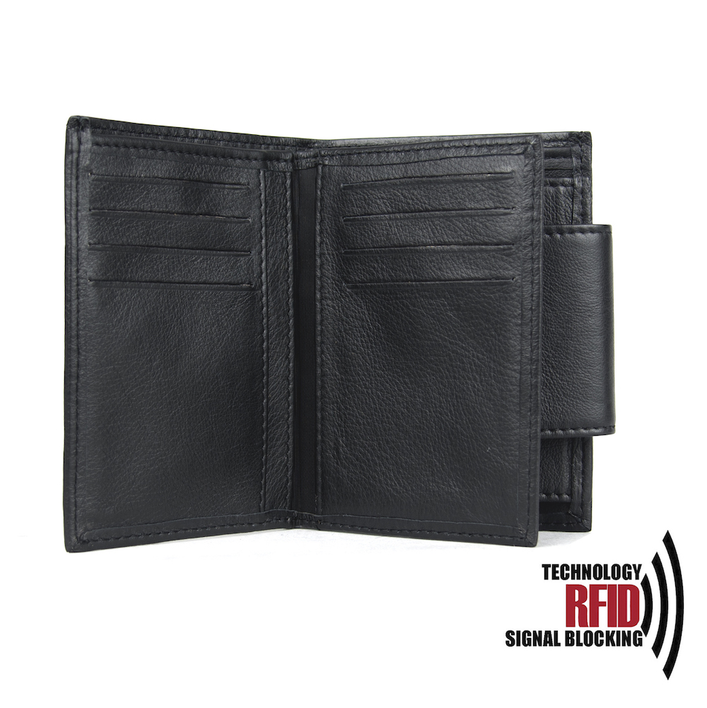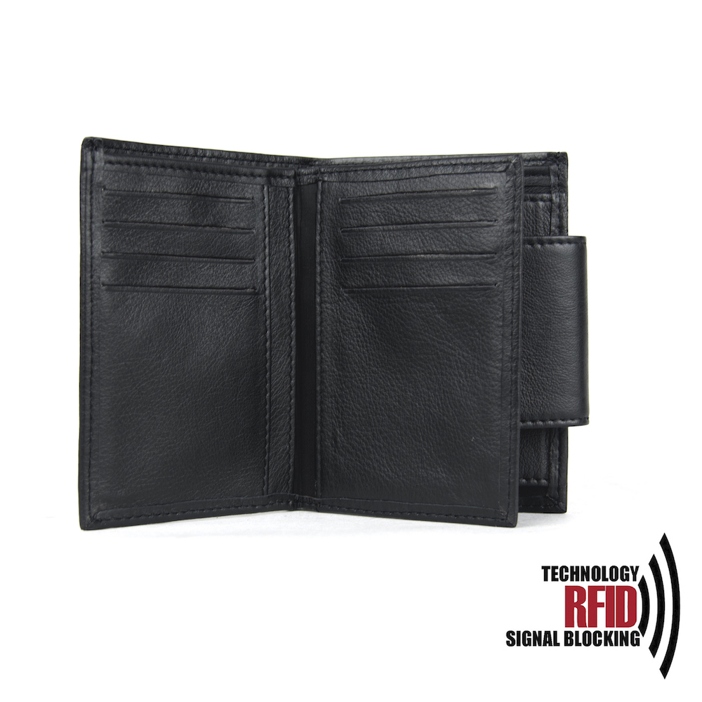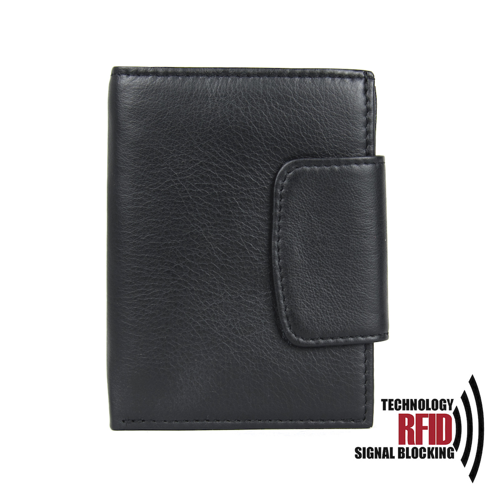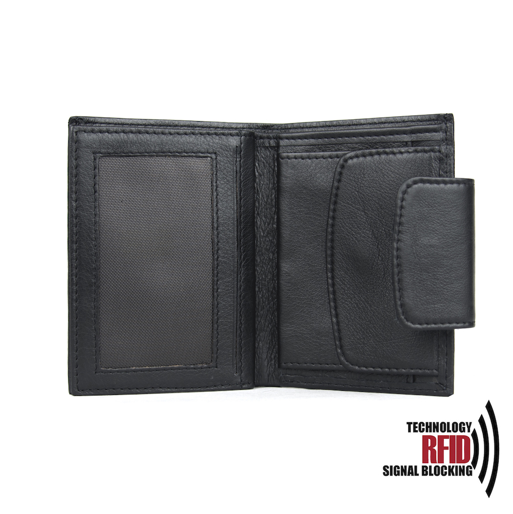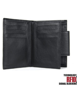 Ochranná kožená peňaženka v čiernej farbe. Táto luxusná kožená peňaženka vám zabezpečí bezpečie pred neopraveným oskenovaním Vašej kreditnej alebo debetnej karty. Peňaženka je v elegantnom vzhľade vyrobená z pravej talianskej kože. Podšívkový materiál v priehradkách na karty tvorí špeciálny materiál z kvalitnej hliníkovo-polymérovej zlúčeniny.